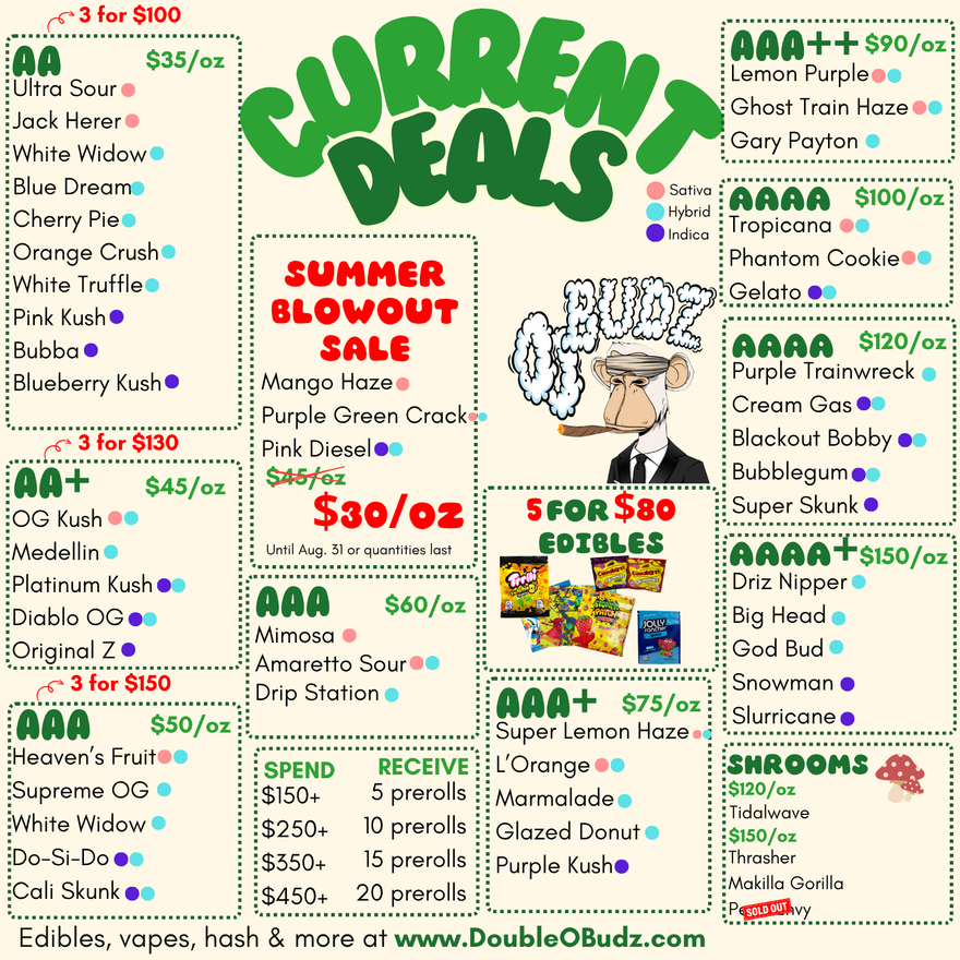 Here at DoubleOBudz, we are dedicated to enhancing our clients' experiences by providing quality products and exceptional customer service. Our extensive menu offers something for all budgets and preferences. Broken scale? Don't know her. By ordering with us, you can rest assured that you are never getting less than what you pay for. If you have any questions, please do not hesitate to reach out.